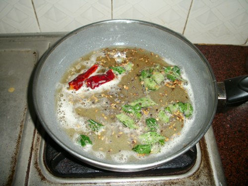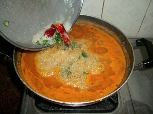 Now make tempering by heating some oil and crackling mustard seeds, cumin seeds, hing, red chilli and curry leaves..