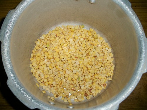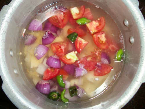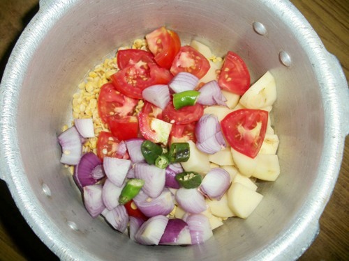 Soak Toor dal for 30 mins and put that in pressure cooker...Add in onion,tomato,potatoes,green chillies to this..