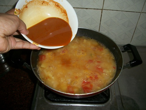 Dissolve tamarind in ½ cup of water. Add in sambar powder and mix well.Set this aside for a moment..